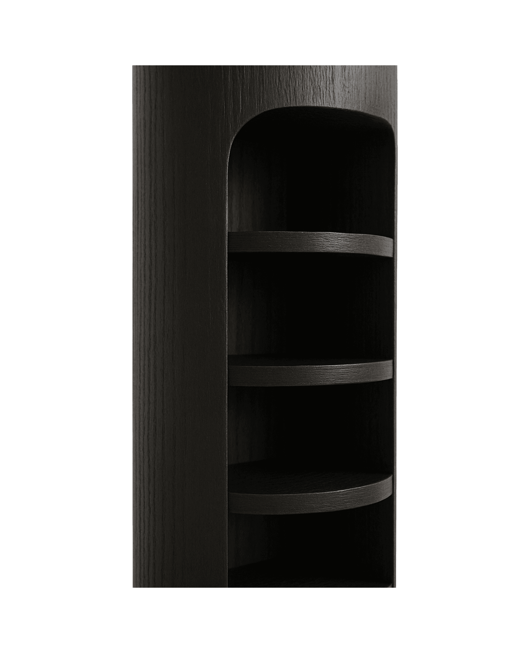 — Numa is a vessel of stillness — a carved monolith in matte blackened oak. Its curved silhouette and softened front opening reveal five sculpted shelves, designed not just for storage but for contemplation. Each arc draws you inward, like an alcove for objects that matter. Whether used for books, relics, or left empty in restraint, Numa holds space with quiet authority. Crafted for those who see furniture as architecture, Numa belongs in rooms that listen as much as they speak.It is a pause.